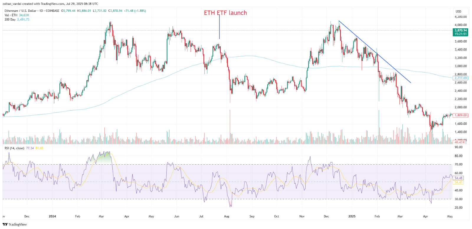 Ether’s price fell over 38% in the two weeks after the spot ETFs debuted for trading in the US, from $3,441 on July 23, down to a local bottom of $2,116 on Aug. 5, before it started recovering, TradingView data shows.