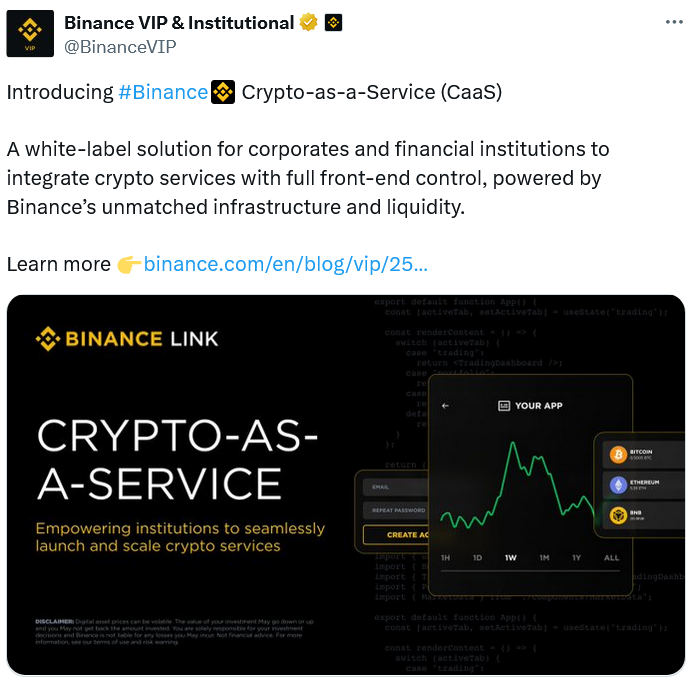 “Institutions retain full control of the front end — their brand, client relationships, and user experience — while Binance powers the back end: supporting trading, liquidity, custody, compliance, and settlement.”