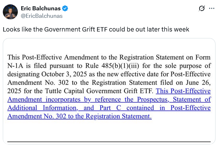 Bloomberg ETF analyst Eric Balchunas noted that GRFT could launch as early as Friday, as the Securities and Exchange Commission on Monday set Oct. 3 as the date that Tuttle’s S-1 registration statement will become effective.