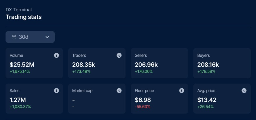 Meanwhile, Base’s DX Terminal took the number four spot in trading volume with $25.5 million, showcasing a nearly 1700% surge, according to DappRadar.