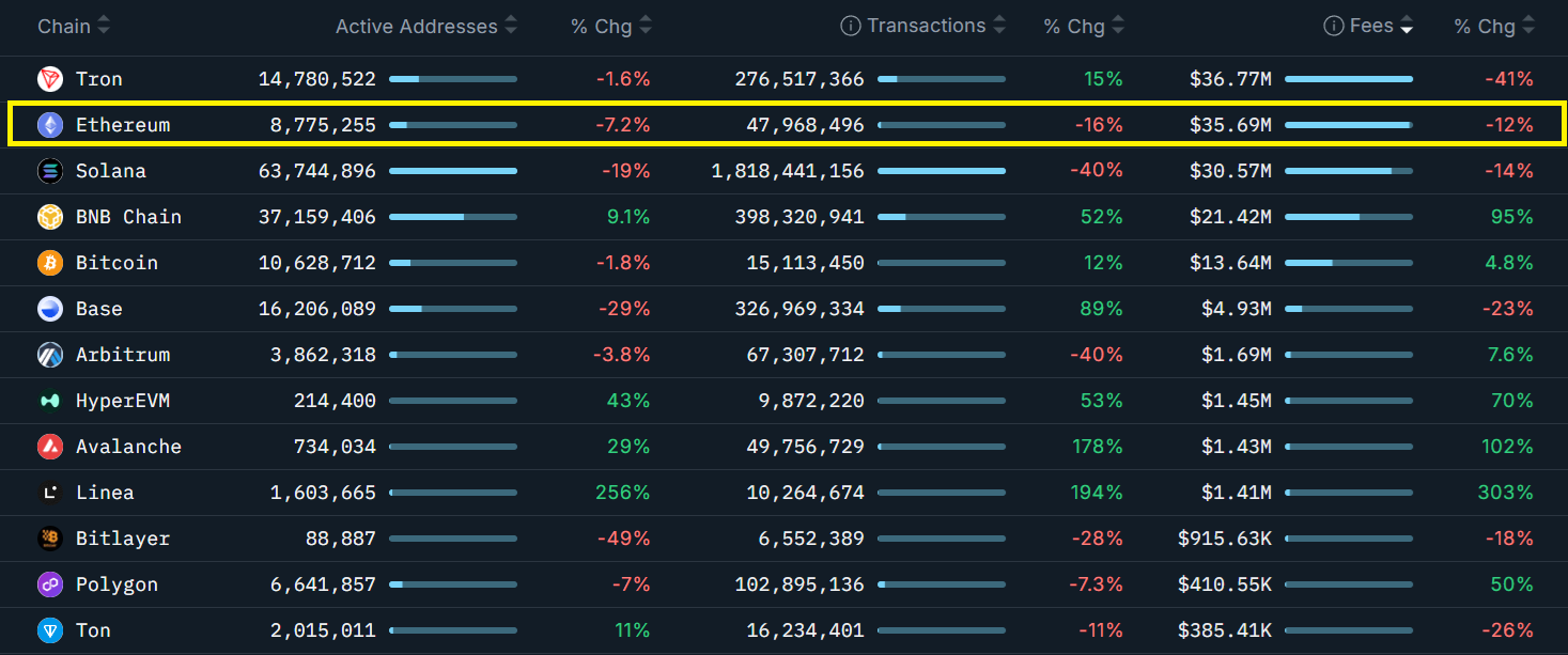 Despite continued accumulation by institutional players, Ether traders remain cautious. Ethereum’s onchain activity has been trending lower, even as some competing networks show the opposite pattern.