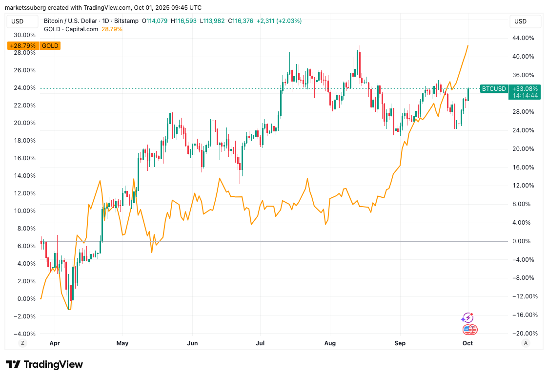 Bitcoin’s latest show of strength came in tandem with a repeat of all-time highs for gold.