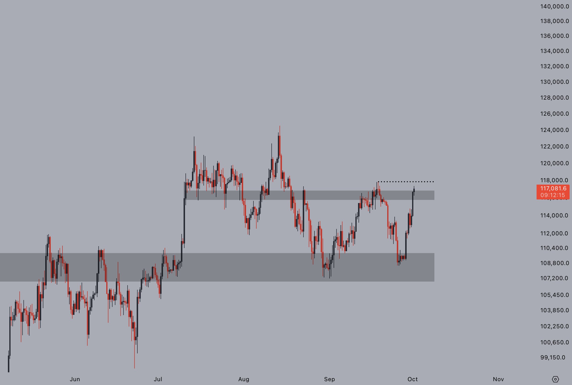 “Bitcoin is trying to breakout from its Monthly Range already on the first day of the new month of October,” popular trader and analyst Rekt Capital summarized in his latest commentary on X.