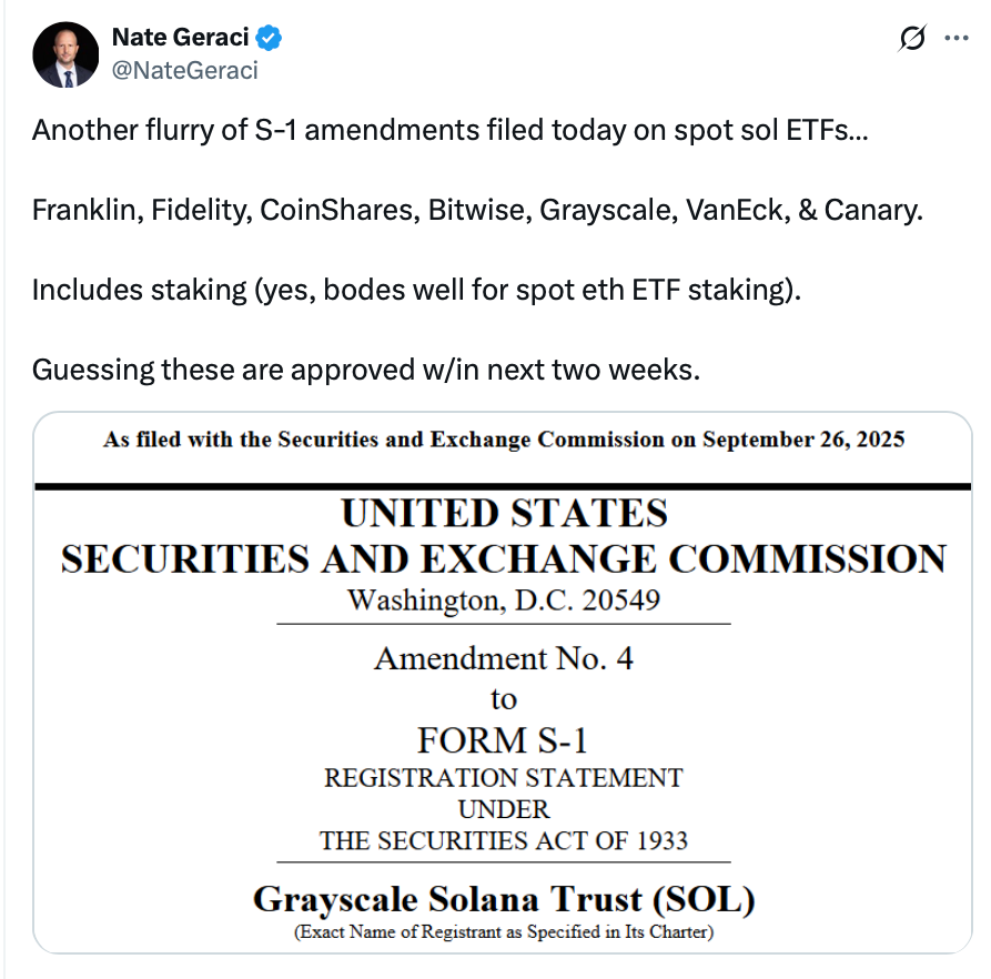 Among them are Solana ETFs from Bitwise, Fidelity, Franklin Templeton, CoinShares, Grayscale Investments, Canary Capital, and VanEck — all of which filed amended S-1 documents with the SEC to update their existing funds’ staking provisions.