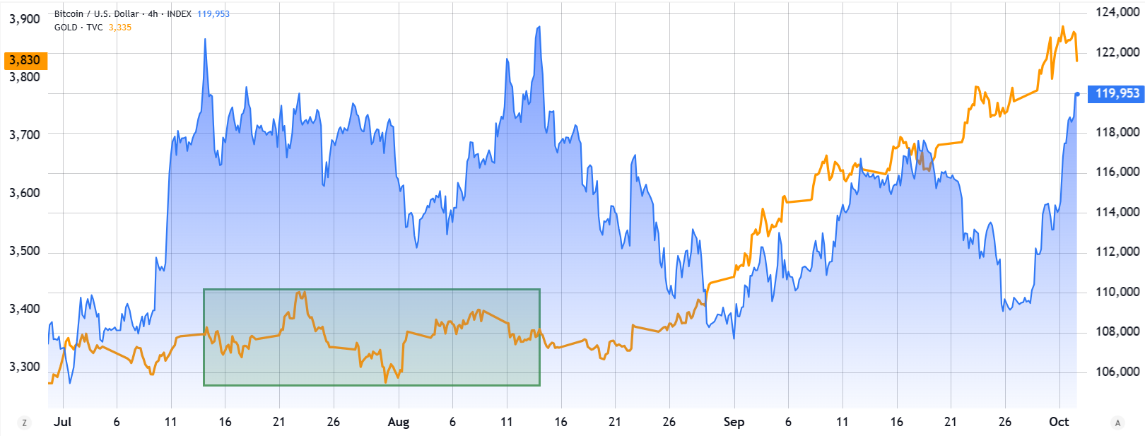 In contrast, gold had stalled near $3,400 for nearly two months prior to mid-August, when Bitcoin surged to its record high. At the time, global trade tensions were intensifying as the temporary 90-day China import tariff reduction by the United States expired on Aug. 12, fueling expectations of looming inflationary pressure.