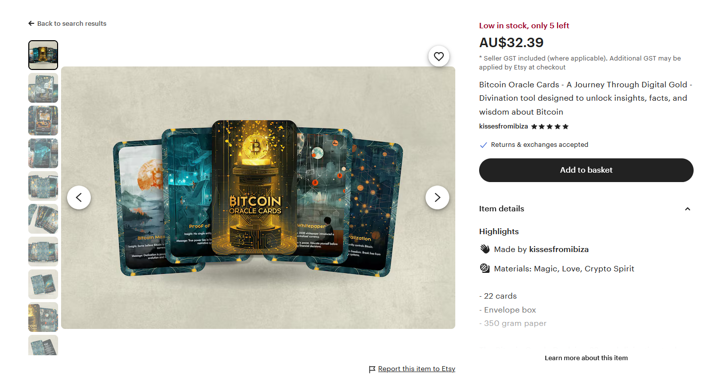 It doesn’t just stop at witchcraft, either. There are also multiple sellers on Etsy offering services like “Bitcoin Oracle Cards,” which allow clients to read their future. The cards are apparently made with “magic, love,” and “crypto spirit.”