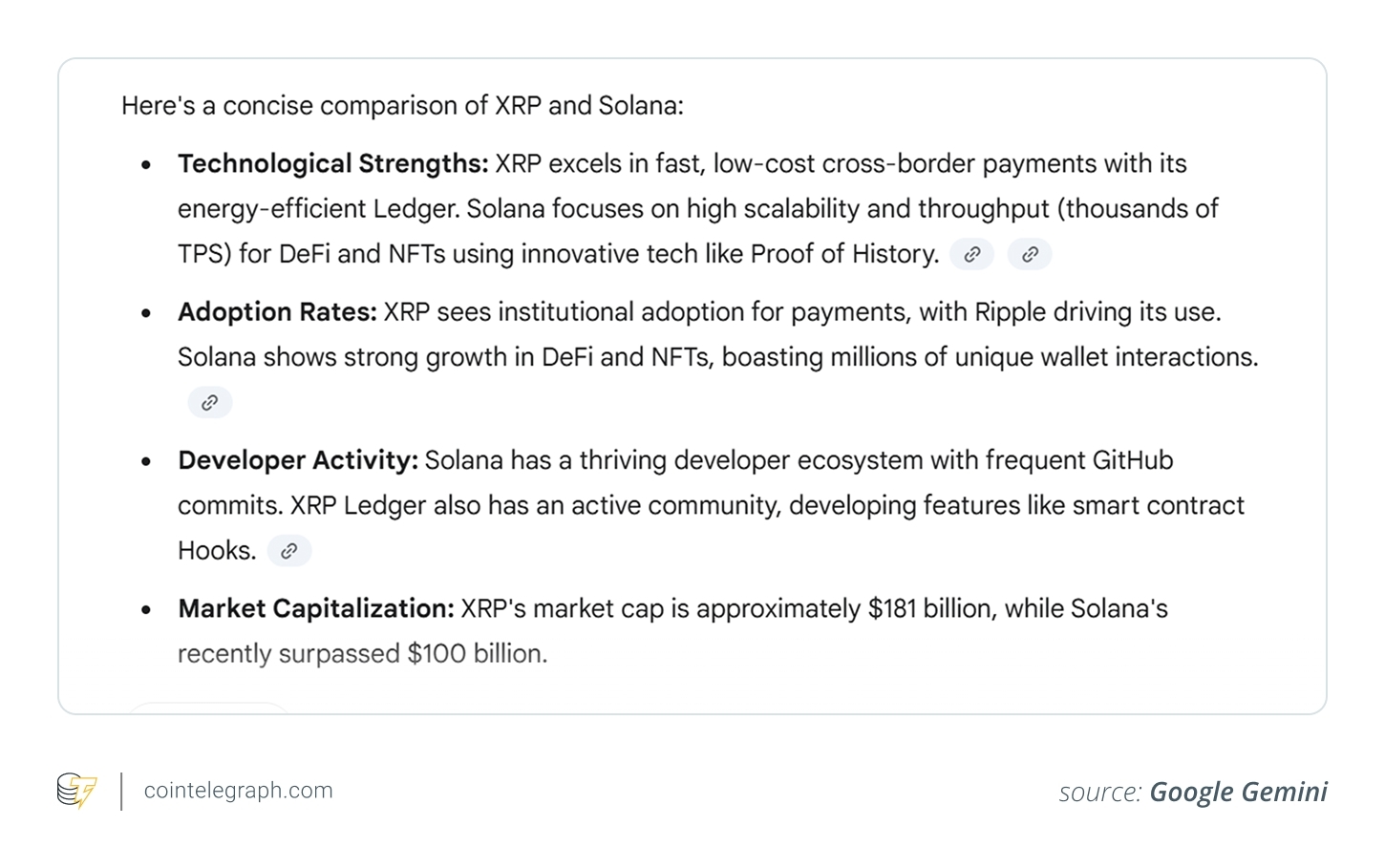 Gemini compares XRP and Solana across four dimensions: XRP focuses on fast, low-cost payments and is used mainly by institutions. Solana emphasizes high-throughput performance for DeFi and NFTs. Developer activity is higher on Solana, while XRP is working on smart contract functionality. However, the market cap data provided by Gemini appears outdated and should be independently verified.