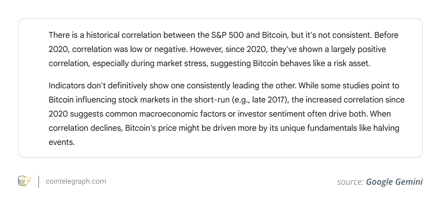 Example prompt: “Is there a historical correlation between the S&P 500 and Bitcoin? What indicators suggest one leads the other?”