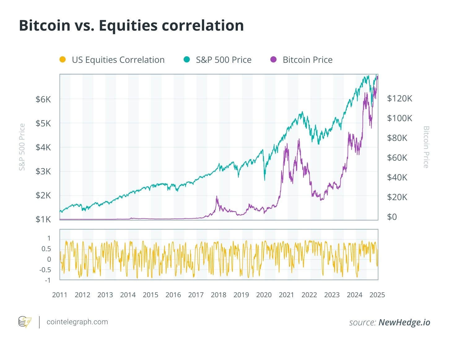 Historically, this correlation has fluctuated in the 0.3–0.5 range but tends to spike above 0.7 during significant market sell-offs. A live chart from NewHedge.io visually supports these patterns, showing periods of strong positive correlation in recent quarters.