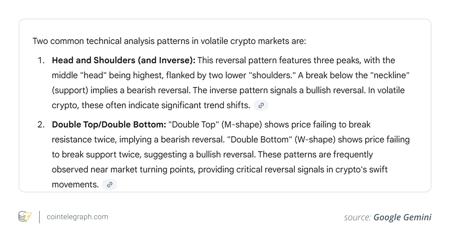 Gemini can explain how common patterns like head-and-shoulders or double tops behave in crypto’s high-volatility environment.