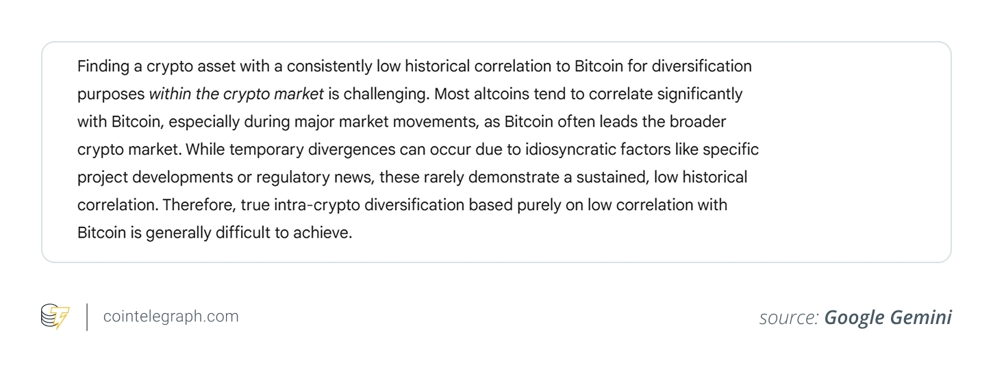 Example prompt: “Suggest one crypto asset that historically has a low correlation with Bitcoin, for diversification purposes.”