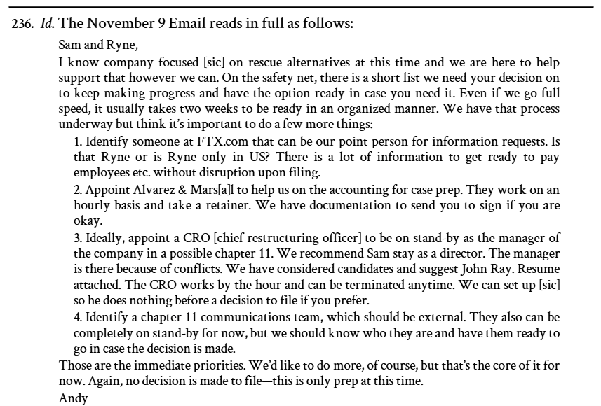 Two days ahead of FTX’s bankruptcy filing on Nov. 9, S&C attorney Andrew Dietderich emailed Bankman-Fried with a plan proposing to hire Ray as a chief restructuring officer “in a possible Chapter 11.”