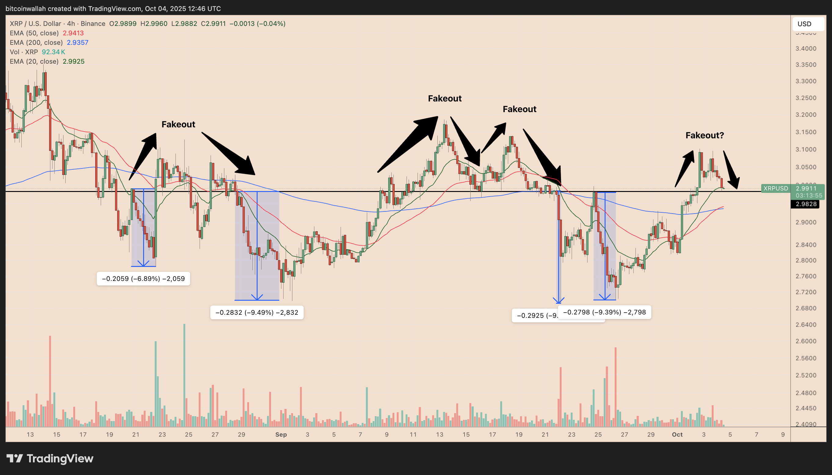 XRP (XRP) has repeatedly broken above the $3 level since its November 2024 boom, but each attempt has ended in a fakeout followed by deeper corrections.