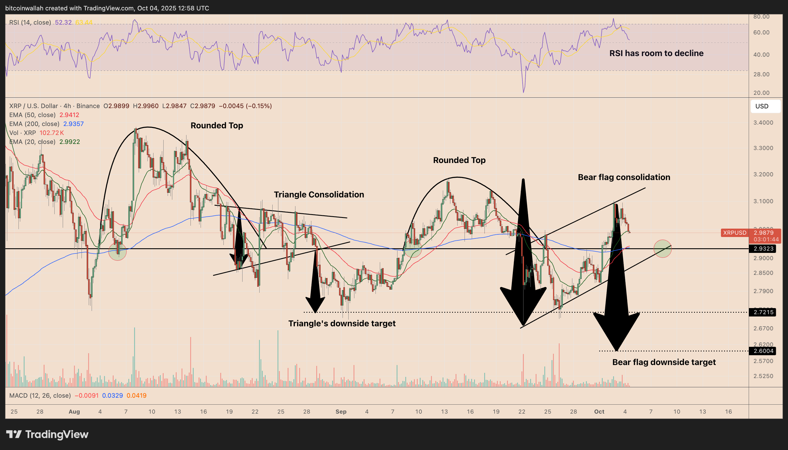 On the four-hour chart, XRP has formed another rounded top and is consolidating within a bearish flag. This structure often leads to another leg lower by as much as the maximum distance between its upper and lower trendlines.