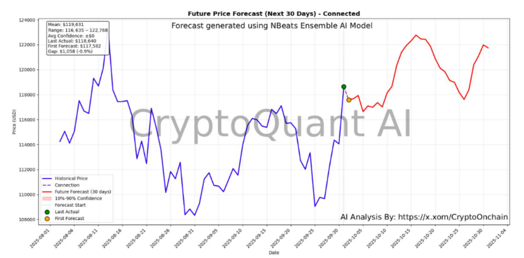 “By combining technical analysis with the AI model’s forecast, the most probable scenario for October 2025 is the continuation of Bitcoin’s neutral, range-bound movement,” CryptoQuant concludes.
