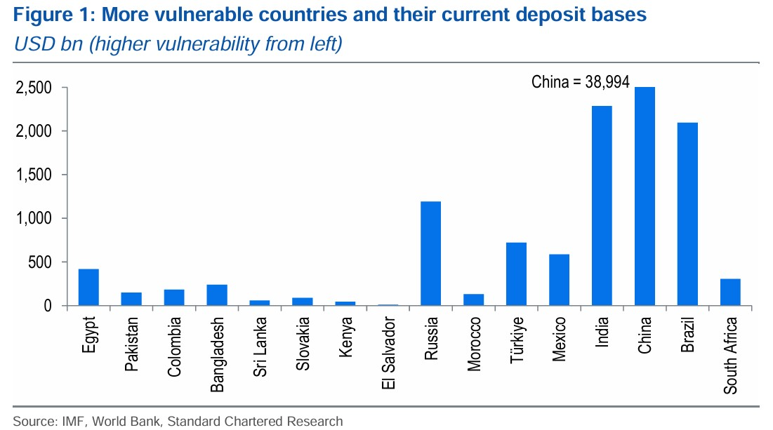 Standard Chartered said this dynamic increases the risk of deposit flight from EM banking systems to crypto alternatives.