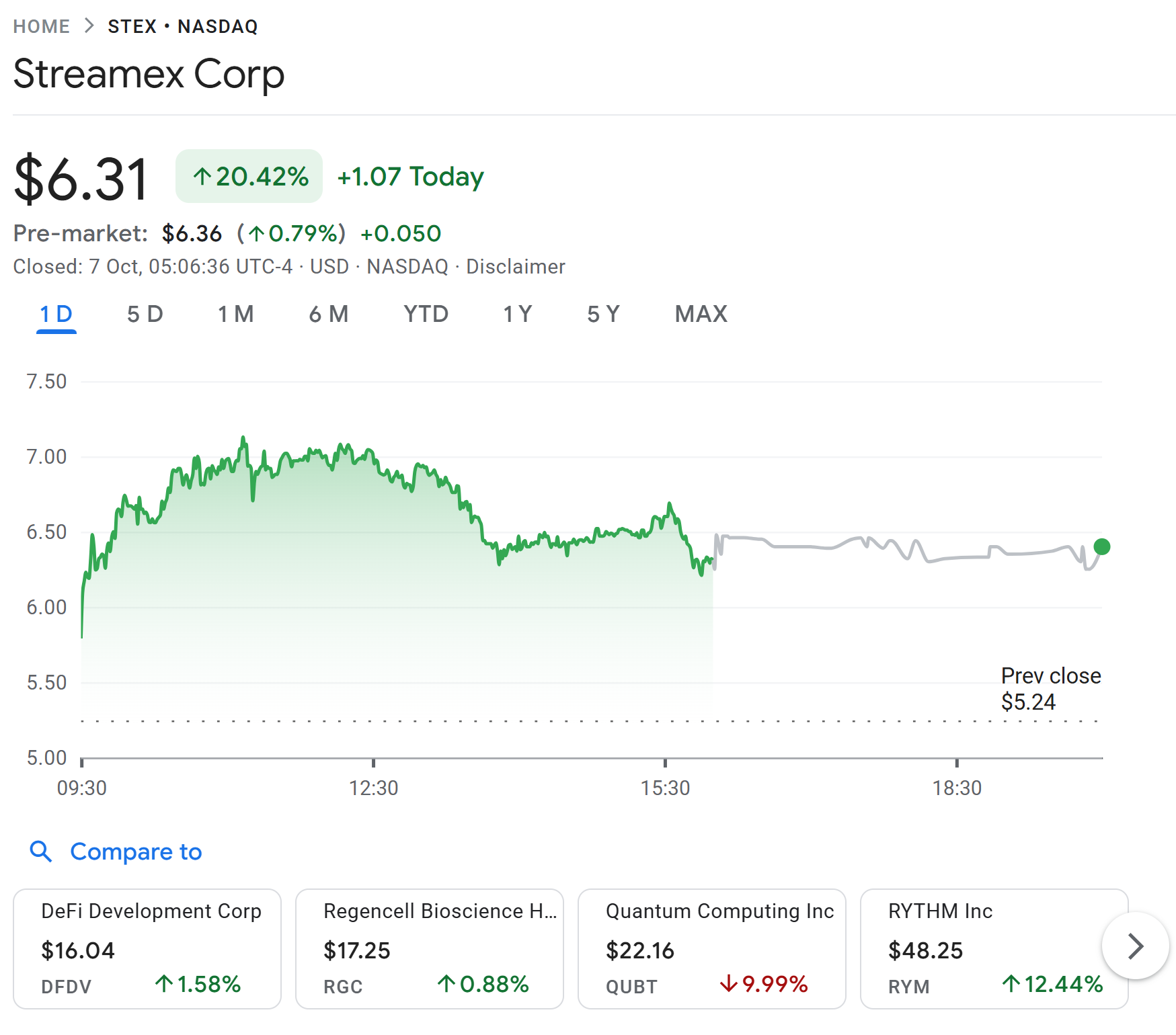 The market responded swiftly to the announcement, with Streamex shares jumping 20.42% on the day and continuing to trade slightly higher in the pre-market session, according to data from Google Finance.