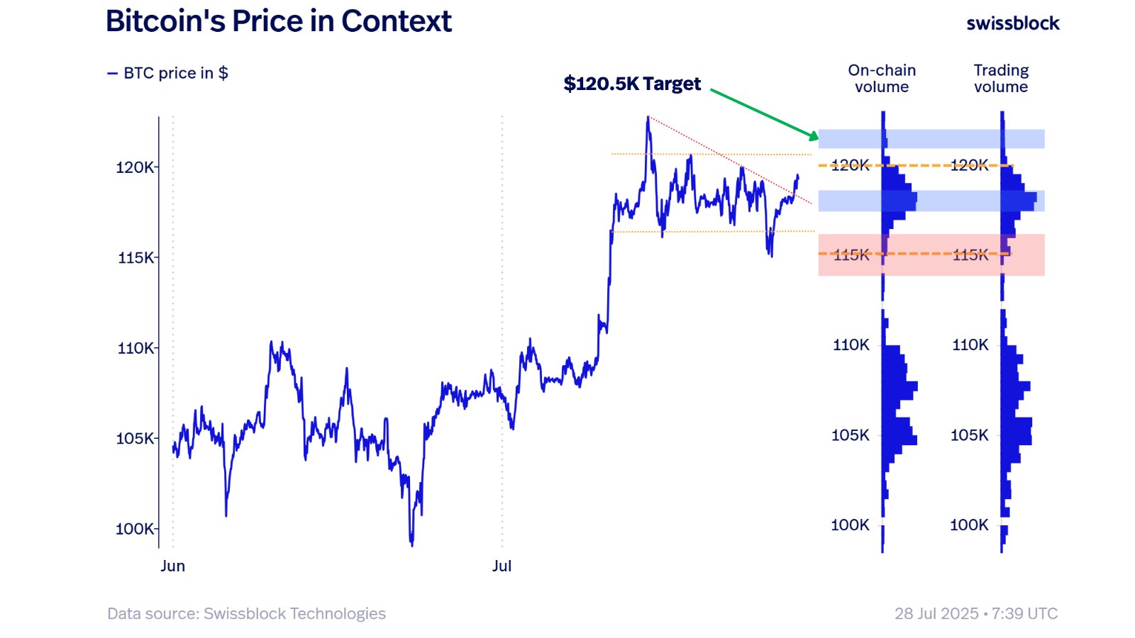 This week’s goal is for Bitcoin to “break above $120,500 with strength and volume,” said private wealth manager Swissblock in a Monday post on X.