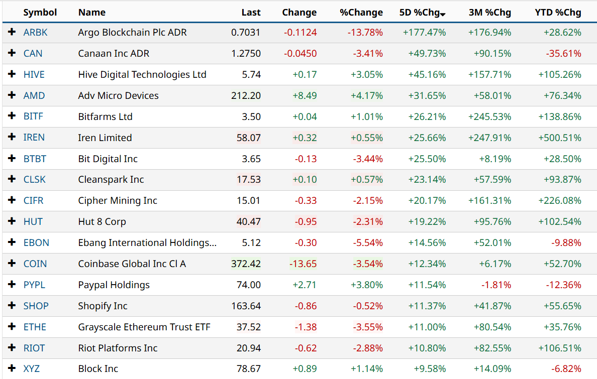 A selection of crypto and blockchain-related stocks spanning Bitcoin mining, exchanges and payment platforms. Source: Barchart