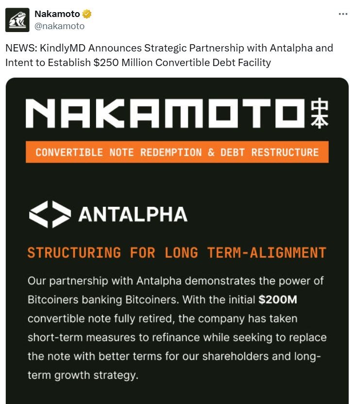 Healthcare company Kindly MD, which merged with David Bailey’s Bitcoin firm Nakamoto, also said on Tuesday that it opted into a $250 million 5-year convertible note deal with fintech company Antalpha, which also seemingly spooked shareholders.