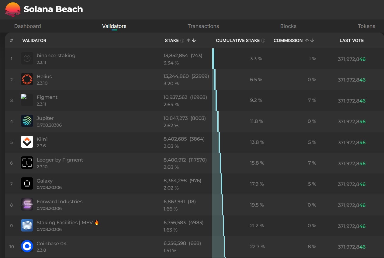 According to Solana Beach, the largest Solana validators are Binance staking, Helius, Figment and Jupiter.