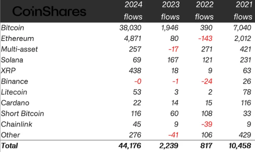 Annual crypto ETP flows by asset since 2021. Source: CoinShares