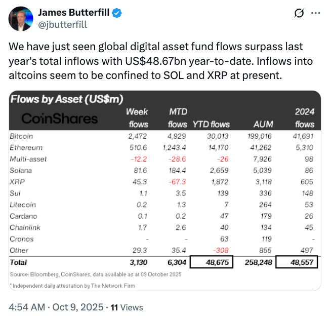 Global crypto exchange-traded products (ETPs) have attracted $48.67 billion so far this year, exceeding the full-year total for 2024, according to CoinShares head of research James Butterfill, who reported the figures in an X post on Thursday.