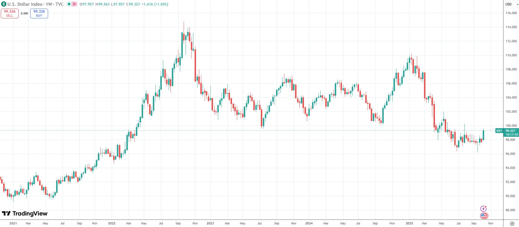 It has fallen by around 12% this year, from a high of 110 in January to a three-year low of 96.3 in mid-September, before recovering slightly in October, according to TradingView.
