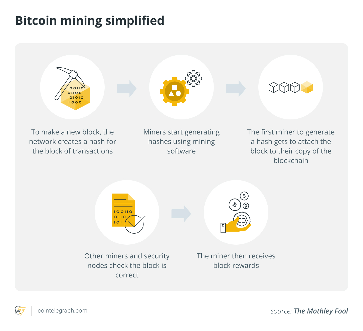Bitcoin (BTC) miners collect pending transactions, bundle them into blocks and repeatedly perform hashing attempts (trial and error) until they produce a hash that meets the network’s difficulty target.