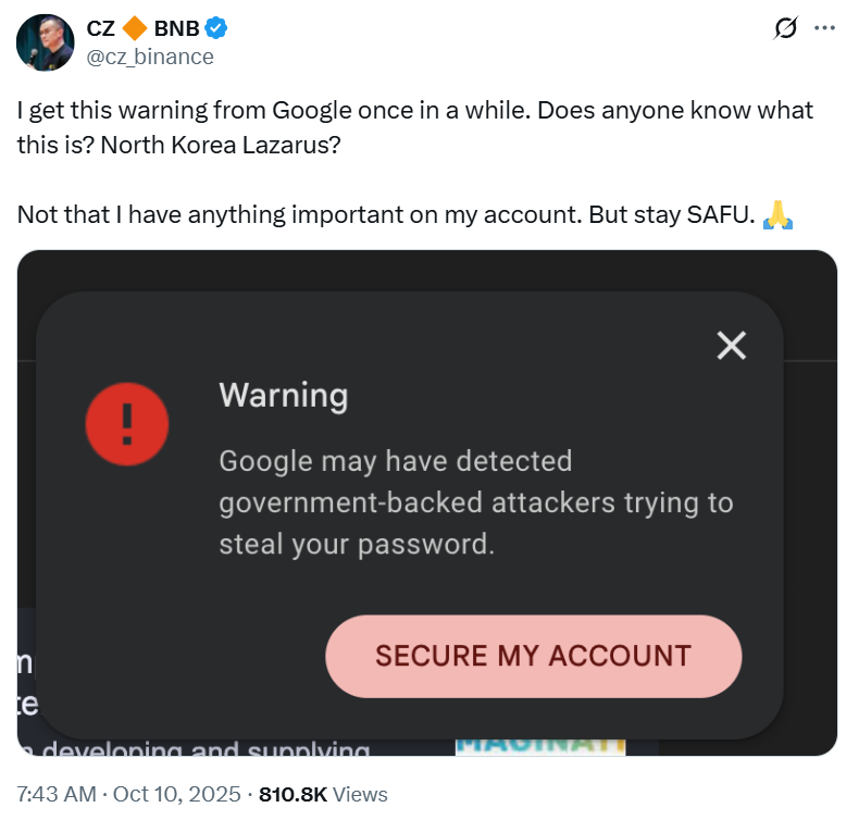 “I get this warning from Google once in a while. Does anyone know what this is? North Korea Lazarus? Not that I have anything important on my account,” said Zhao in a Friday X post.