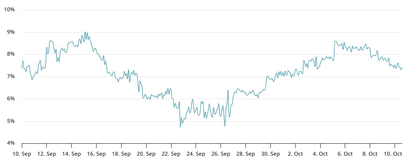 Monthly Bitcoin futures are trading at a 7% premium compared to spot markets, showing little change over the week. Periods of strong optimism typically push this premium above 10% as demand for leveraged long positions rises. However, data indicates traders’ confidence has not improved, even after Bitcoin’s 14% rally between Sept. 28 and Oct. 7, as the indicator remains near the same level as a month ago.